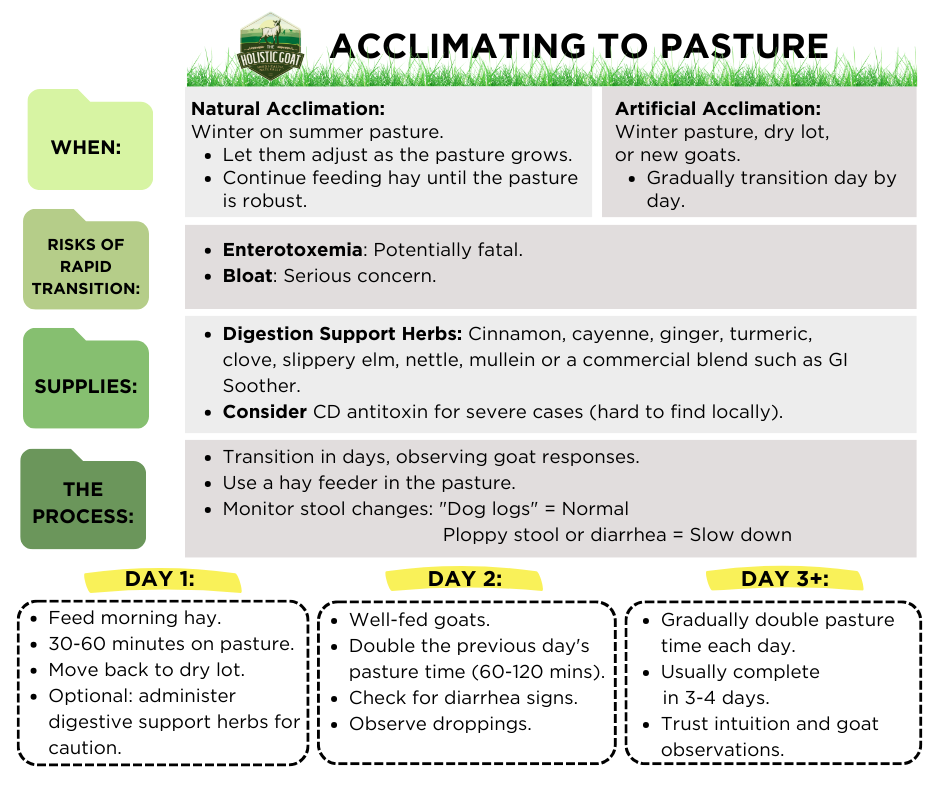 Unlimited, sudden access to pasture can cause several health issues, some of them serious and potentially fatal, so it is imperative to gradually acclimate goats when it’s time to move to pasture. Start by putting your goats out into the pasture area for 30-60 minutes the first day. Turn them out later in the day and be sure they’ve eaten hay before going out. After the time is up, return them to their winter pen for the day. On day two, check for signs of digestive upset – namely, diarrhea. If they have normal stools, increase the time on pasture today to two hours. On day three, repeat the check, then leave them out for four hours. If on day four stool is normal, leave them out for eight hours and on day five, assuming normal digestion, they are ready to stay out full time.