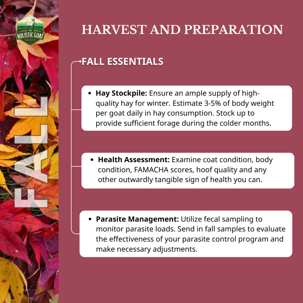 Though you may not have had many health issues during the summer, it’s a good idea to have a good long look at everyone in fall as they’re heading into winter, traditionally one of the tougher seasons for overall health. You’ve kept an attentive eye all along, but now’s the time to really examine everyone for any health issues that could potentially be exacerbated by winter conditions. Examine coat condition, body condition, FAMACHA scores, hoof quality and any other outwardly tangible sign of health you can. If you use fecal sampling to determine parasite loads, send in a fall sample to be sure your parasite program is working and use this time to make changes if you have high counts.