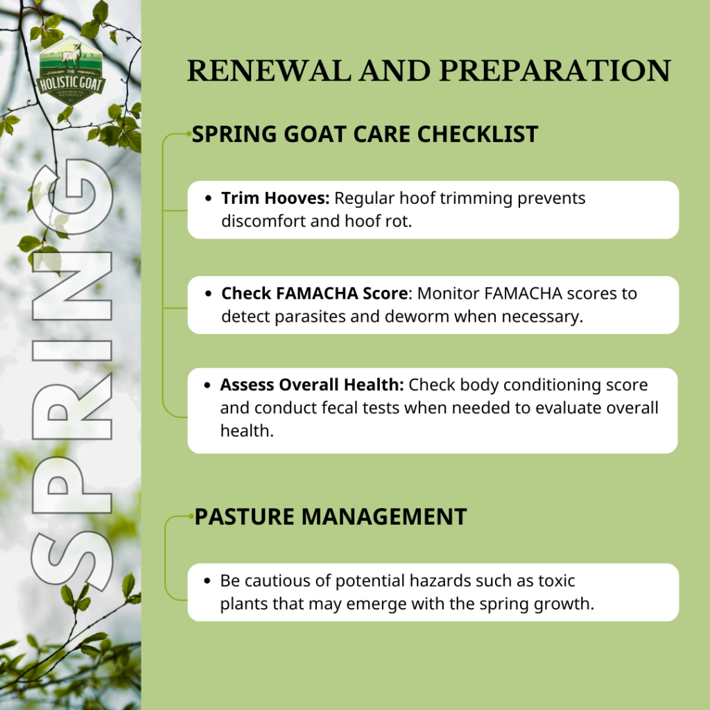 Parasites tend to be more of an issue in wet spring. If your goats are young kids, coccidiosis can be of particular concern in the wet of spring. We’ll talk more about specific conditions and treatments later, but this is the time of year to pay more attention to parasite issues and be especially diligent about checking FAMACHA scores and watching for signs of digestive trouble – clumpy or runny manure.